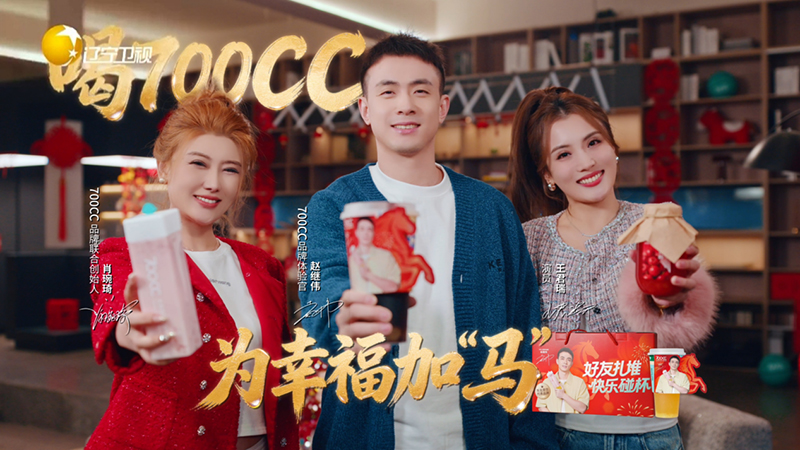 同时700CC品牌联合创始人肖琬琦、品牌体验官赵继伟及演员王君瑞共同拍摄的新年贺岁TVC也同步登录辽宁卫视,以喝700CC为幸福加“马”为主题,为全国观众送上了新春祝福。