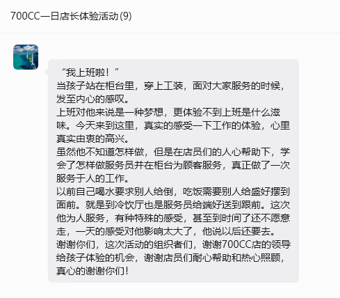 荣誉店长活动结束后,家长们也分享了这一天的感受,家长们表示活动结束后“星宝”们充满了欣喜,表示以后还要继续参加这类活动,从一天的体验中也看到了“星宝”的改变,对品牌表示了感谢。家长们表示,从被人照顾,到服务顾客,这种被需要、被认可的感觉,让“星宝”感受到了互动的温度。