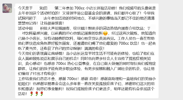 华易公益基金会项目负责人介绍,关爱孤独症群体,不仅需要医疗干预,更需要社会能提供更多被信任的岗位实践机会,两次活动中“星宝”们通过沟通和互动这些动作,会得到肯定和感谢,这种即时的、正向的社会性强化,是“星宝”们构建社交信心的重要基石。
