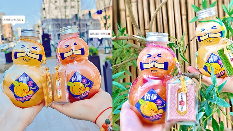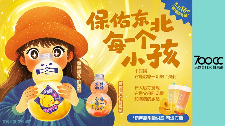 在东北孩子的童年里,黄桃罐头是生病时的甜蜜犒赏,是只有发烧时才能享用的“特效药”,700CC巧妙地将这种情感记忆融入黄桃罐头鲜草莓和黄桃罐头鲜凤梨产品。有消费者反馈,拿到700CC黄桃新品时,发现包装设计成葫芦形状,引发了一波回忆杀。品牌不仅保留了黄桃的经典风味,还通过葫芦瓶的创意包装和赠送平安福周边激发消费者的情感共鸣。