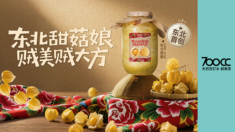 菇娘这一东北特色水果,成为700CC展现东北女性特质的载体。新品以“东北甜菇娘,贼美贼大方”为主题精准捕捉了地域文化特征,菇娘果外形精致,口感清甜,恰如东北姑娘的外柔内刚。700CC通过这一产品,向消费者传递着东北姑娘豪爽大方、美丽自信的形象。