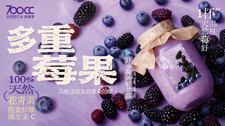 700CC的多重莓果系列产品:好多莓神鲜甘露及好多莓果茶选用了东北土地孕育的多种莓果,包括蓝莓、不老莓、黑莓和桑葚等。这些莓果富含天然花青素、膳食纤维和维生素C,展现着东北自然资源的丰富性。